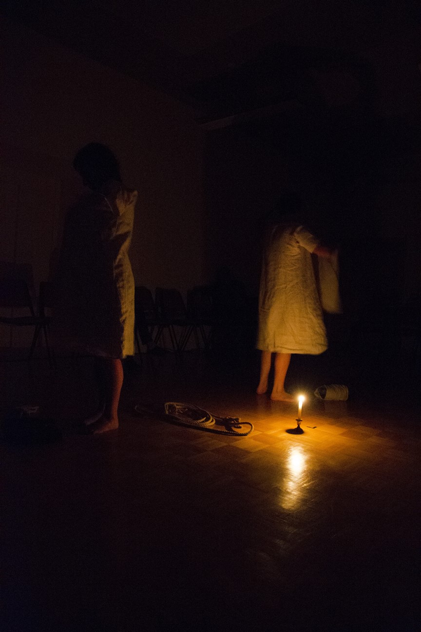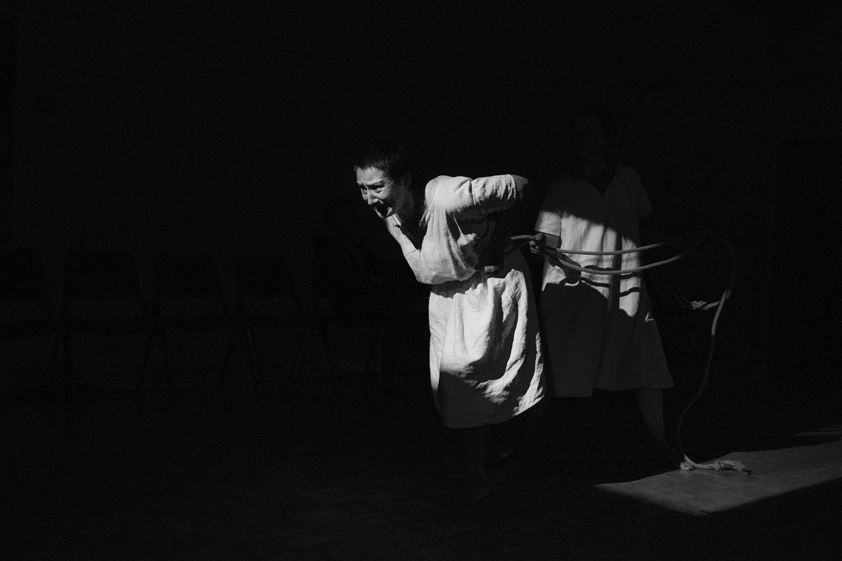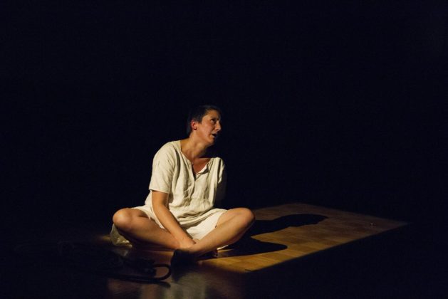 In una sorta di preambolo allo spettacolo, che si svolge per intero catturando l’attenzione del pubblico al centro della sala, due donne vestite di bianco sono intente nei più svariati lavori della vita contadina. La gestualità e i movimenti dei corpi danzanti sembrano restituire dignità all’elemento femminile e ai riti legati alla sua fertilità. La scena potrebbe infatti anche collocarsi in un tempo molto più remoto, dove la gestione del sacro era ancora di pertinenza femminile. Ma in alcuni gesti del lavoro e nella preghiera, scanditi in modo ripetitivo, a tratti quasi ossessivo, già si può intravedere l’infamia che sta per incombere sull’onore delle due donne: come ad esempio quando, stropicciando il vestito o strofinandosi le mani, esse sembrano voler ripulirsi di un’onta che le attanaglia nel corpo e nell’anima. In un crescendo carico d’effetto, la danza sfocia poi in un lungo elenco di nomi di donne giustiziate per stregoneria in varie parti d’Europa e si conclude con quello di Caterina Lardello. Una fra le tante malcapitate che furono torturate e condannate alla pena capitale da parte del tribunale laico di Poschiavo durante quell’oscuro frangente storico. Attorno alla sua tragica vicenda si sviluppa la parte principale dello spettacolo, che vede Begoña Feijoó Fariña nella parte di un’imputata e Chiara Balsarini in quella di accusatrice e giudice.