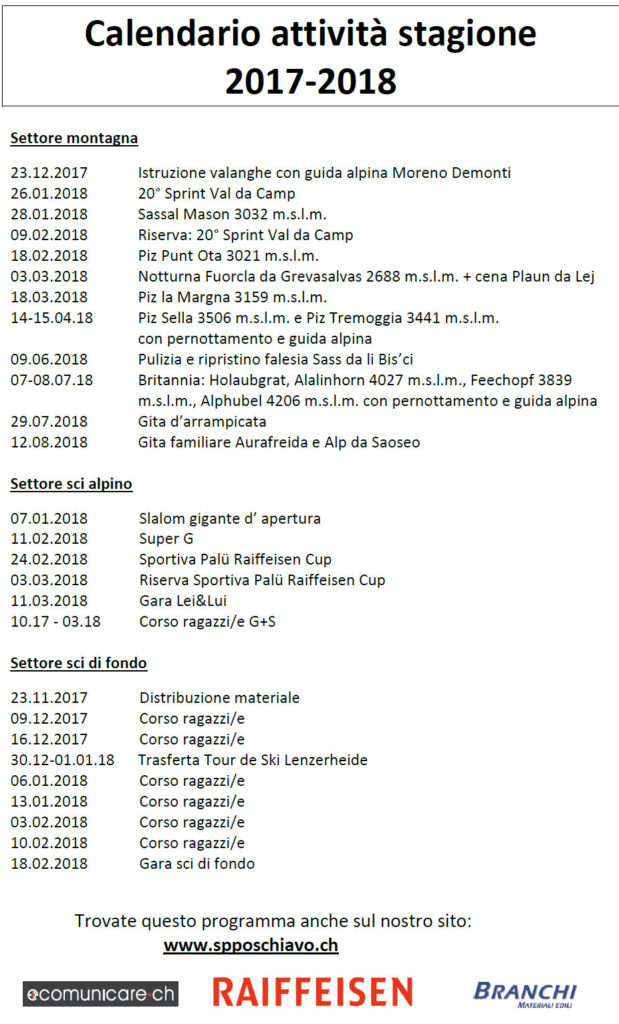 Senza categoria Calendario attività e ringraziamenti Stagione 2017-2018 Di Sportiva Palü Poschiavo - 1 Novembre 2017 0 240 Per scaricare il calendario clicca qui. La SPP desidera inoltre ringraziare tutti i suoi sponsor.