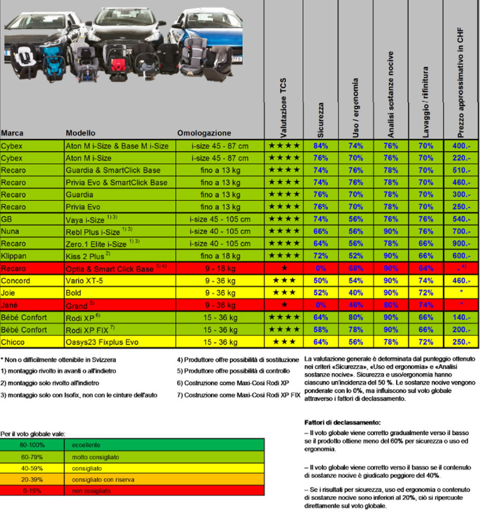 Tutti i seggiolini sono stati esaminati e valutati nella sicurezza, maneggevolezza, ergonomia, presenza di sostanze nocive, la facilità di pulizia e la lavorazione. I modelli classificati “consigliato” hanno superato le prescrizioni legali e la valutazione ha tenuto conto delle esigenze riguardanti la tutela dei consumatori, come è stato il caso per i modelli: Cybex, GB, Nuna, Klippan, Concord, Joie, Maxi-Cosi, Chicco e per quasi tutti quelli di Recaro.