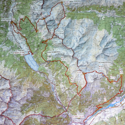 Il percorso porterà in seguito alla Bocchetta di Braga (Passo di Pedruna), dove si entrerà in Val Grosina. Da Malghera, dove ci sarà l’ultimo cambio per la staffetta a tre, si salirà verso la Forcola da Sassiglion (Passo di Malghera) per tornare nuovamente in Svizzera. A Poschiavo è previsto il passaggio sulla piazza comunale. Da lì si risalirà per percorrere il sentiero “Alta Tensione” per giungere finalmente a Le Prese. Nei pressi del traguardo vi sarà un mercatino con prodotti locali e un capannone dove sarà possibile cenare in compagnia e festeggiare fino a notte fonda.