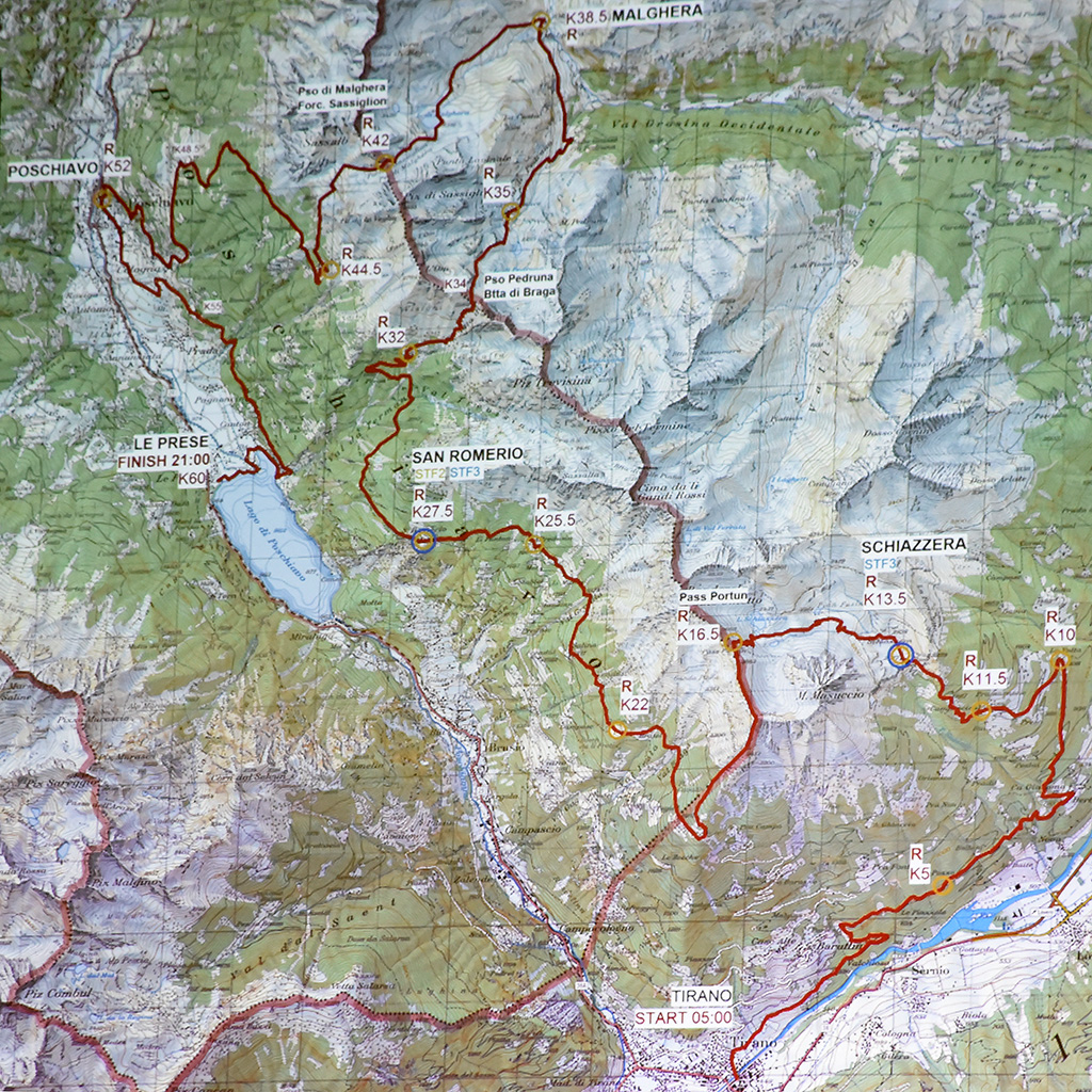 Da Tirano il percorso porterà a Baruffini, per poi raggiungere Schiazzera transitando per il Piano del Sole, Rogorbello e Susen. A Schiazzera è previsto il primo cambio per la staffetta a tre. Continuando per il Passo dal Purtun si valicherà il confine, dopo di che gli atleti raggiungeranno San Romerio, dove ci sarà il secondo cambio per la staffetta a tre, rispettivamente il primo per chi gareggerà in team composti da due podisti.