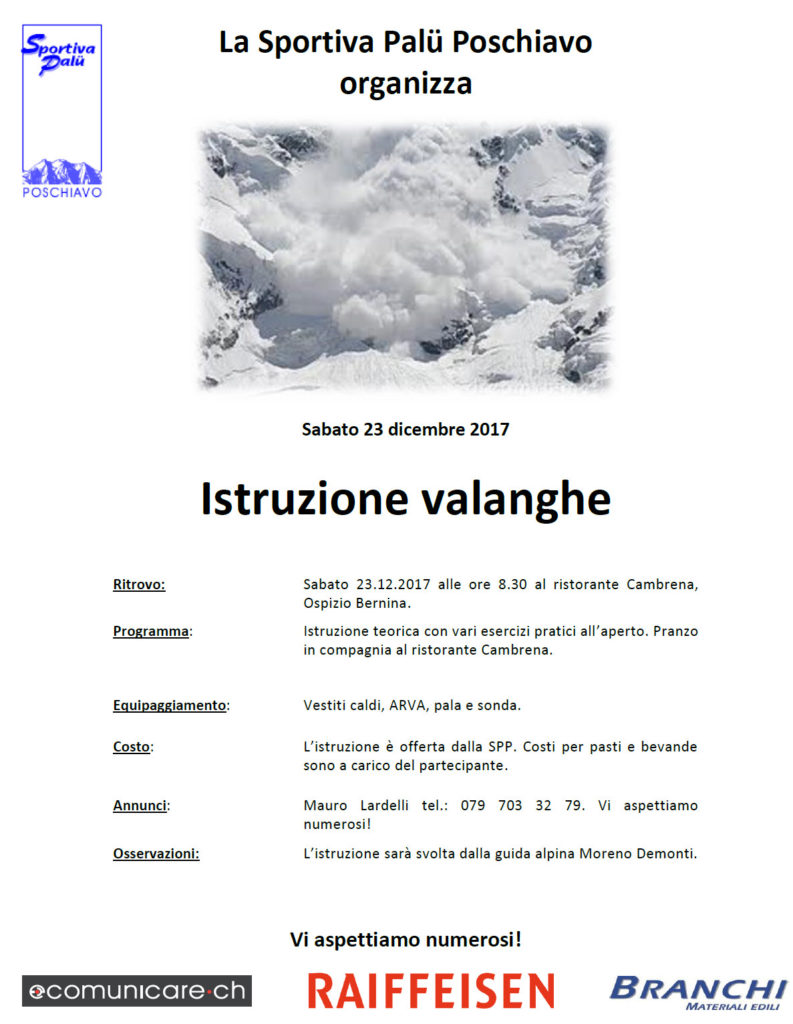 Senza categoria Istruzione valanghe Sabato 23 dicembre Di Sportiva Palü Poschiavo - 19 Dicembre 2017 0 100 Per scaricare la locandina clicca qui.