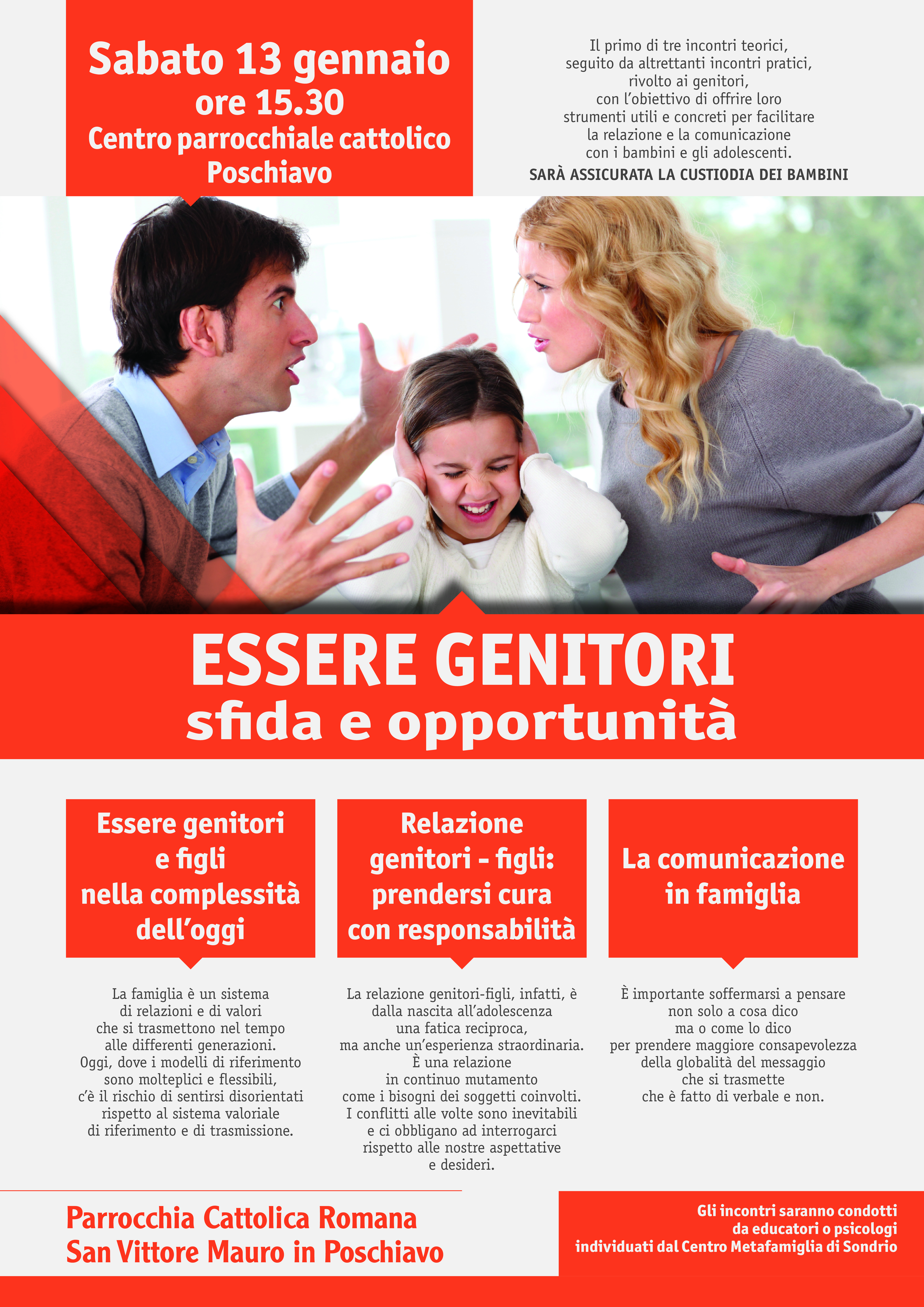 A partire da sabato 13 gennaio (appuntamento alle ore 15.30 in centro parrocchiale) la Parrocchia Cattolica Romana San Vittore Mauro in Poschiavo intende proporre tre incontri teorici e altrettanti pratici ai genitori, con l’obiettivo di offrire loro strumenti utili e concreti per facilitare la relazione e la comunicazione con i bambini e gli adolescenti.