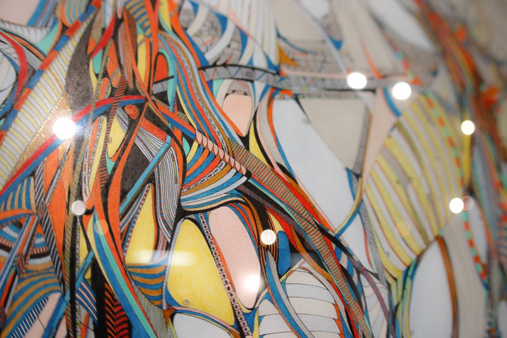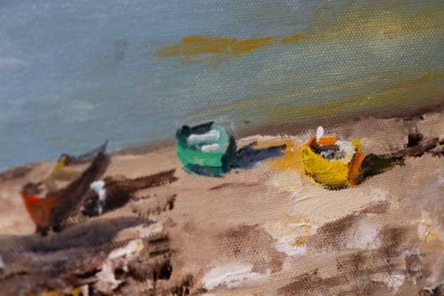 Accese le luci ho fatto un giro di saluto ai quadri esposti bisbigliando il numero corrispondente in segno di educazione. Non dovrei dirlo, ma i miei dipinti li ho accarezzati: stavano facendo un buon lavoro e quel gesto di affetto mi è uscito spontaneo.