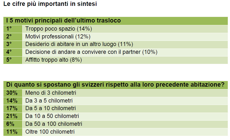 Solitamente gli scatoloni dei traslochi non devono fare molta strada: durante l’ultimo trasloco il 30 per cento si è spostato nel raggio di soli 3 chilometri, solo il 6 per cento ha percorso da 50 a 100 chilometri e l’11 per cento si è trasferito a oltre 100 chilometri. I motivi alla base dei traslochi sono: troppo poco spazio nel vecchio appartamento (14 per cento), cambio di lavoro (12 per cento), il desiderio di abitare in un altro luogo (11 per cento), la decisione di andare a convivere con il partner (10 per cento) o l’affitto troppo alto (8 per cento). Interessante è il fatto che la percentuale (13 per cento) degli intervistati più anziani (da 56 a 74 anni) che hanno ammesso di essersi dovuti trasferire a causa dell’affitto troppo alto, è risultata più del doppio superiore rispetto alle altre fasce di età. «Per questa generazione, i figli spesso se ne sono già andati di casa. Al tempo stesso questa fascia di età si ritrova a fare i conti con un reddito più basso, al più tardi al momento del pensionamento. Di conseguenza, la richiesta di spazi abitativi più piccoli ed economici aumenta» dichiara Michael Kohlas.