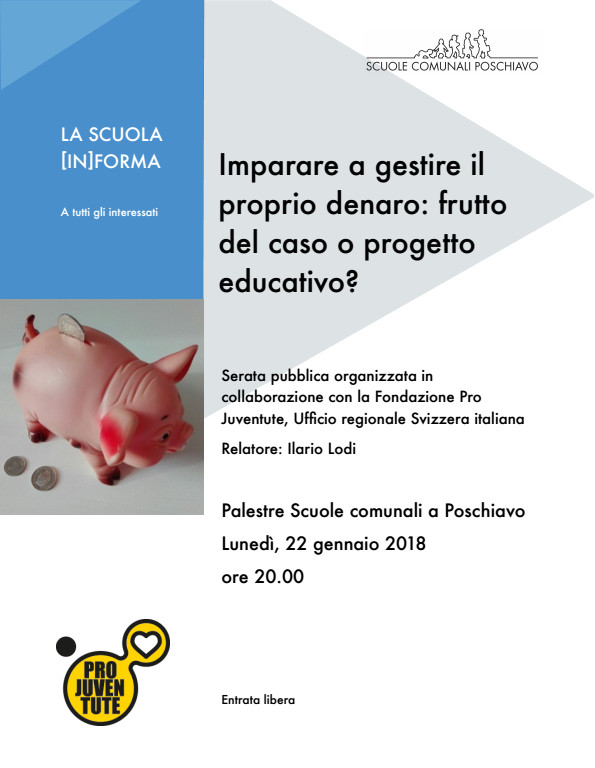 Le scuole comunali di Poschiavo organizzano, lunedì 22 gennaio alle ore 20.00 presso le palestre, un incontro dal titolo “Imparare a gestire il proprio denaro: frutto del caso o progetto educativo?”. La serata pubblica, a entrata libera, è organizzata in collaborazione con la Fondazione Pro Juventute e l’Ufficio regionale Svizzera italiana.