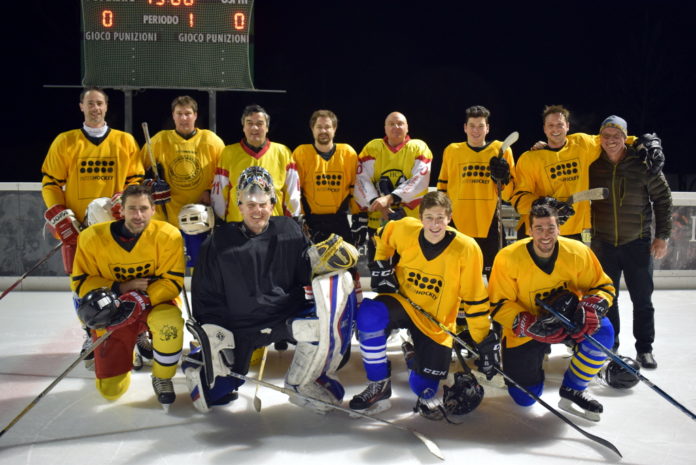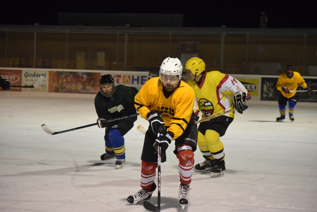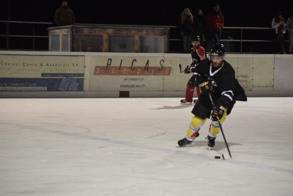 I campioni in carica Paganini Frutta, capitanati dal patron Raffaele, partono a spron battuto e infilano subito con il tesserato Coduri un Pir del tutto sorpreso. Risponde l’altro capitano storico, Fabio Pola, chiudendo con consumata scaltrezza una manovra ben congeniata dai suoi. Pari e patta alla prima pausa. Anche nel secondo periodo i ritmi rimangono alti, e i giochi si fanno più duri. La navigata coppia d’arbitri composta da Toto Platz e Gianluca Balzarolo deve intervenire, invitando qualcuno ad accomodarsi per qualche minuto sulla panchina dei penalizzati. Nonostante la qualità di gioco forse migliore degli ex calciatori, sono i campioni in carica che con molta energia vanno in gol con i vari Paganini, Lardi e Coduri. Allo scadere della seconda frazione il sottoscritto si ricorda di essere stato un giocatore di hockey e riesce a sorprendere un Luca Crameri già in grande spolvero. Nel terzo tempo il giovane Alessio Sala segna per la VPC on ice, riaprendo per pochi istanti la partita. Coduri non ci sta e con la sua tripletta chiude i giochi.