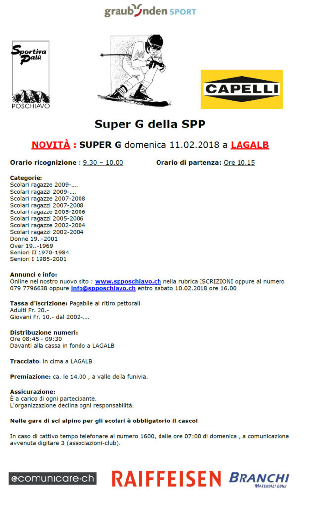 Senza categoria Super G della SPP Domenica 11 febbraio Di Sportiva Palü Poschiavo - 29 Gennaio 2018 0 147 Per scaricare la locandina clicca qui.
