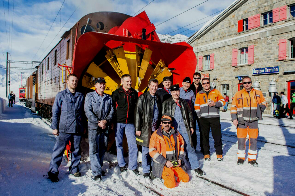Sono numerosi gli addetti al funzionamento dei veicoli storici della Ferrovia Retica. Lo testimonia la foto realizzata domenica 28 gennaio 2018 in occasione di una delle poche uscite invernali della “X rot d 9213” (anno di costruzione 1910), di nuovo protagonista lungo la tratta della Ferrovia del Bernina.