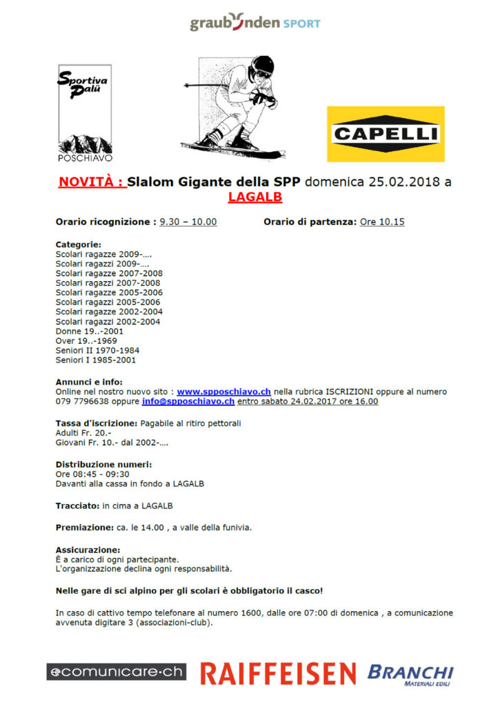 Senza categoria Slalom Gigante SPP – Rinviato per maltempo Data da destinarsi Di Sportiva Palü Poschiavo - 12 Febbraio 2018 0 126 Rinviato per maltempo a data da destinarsi.