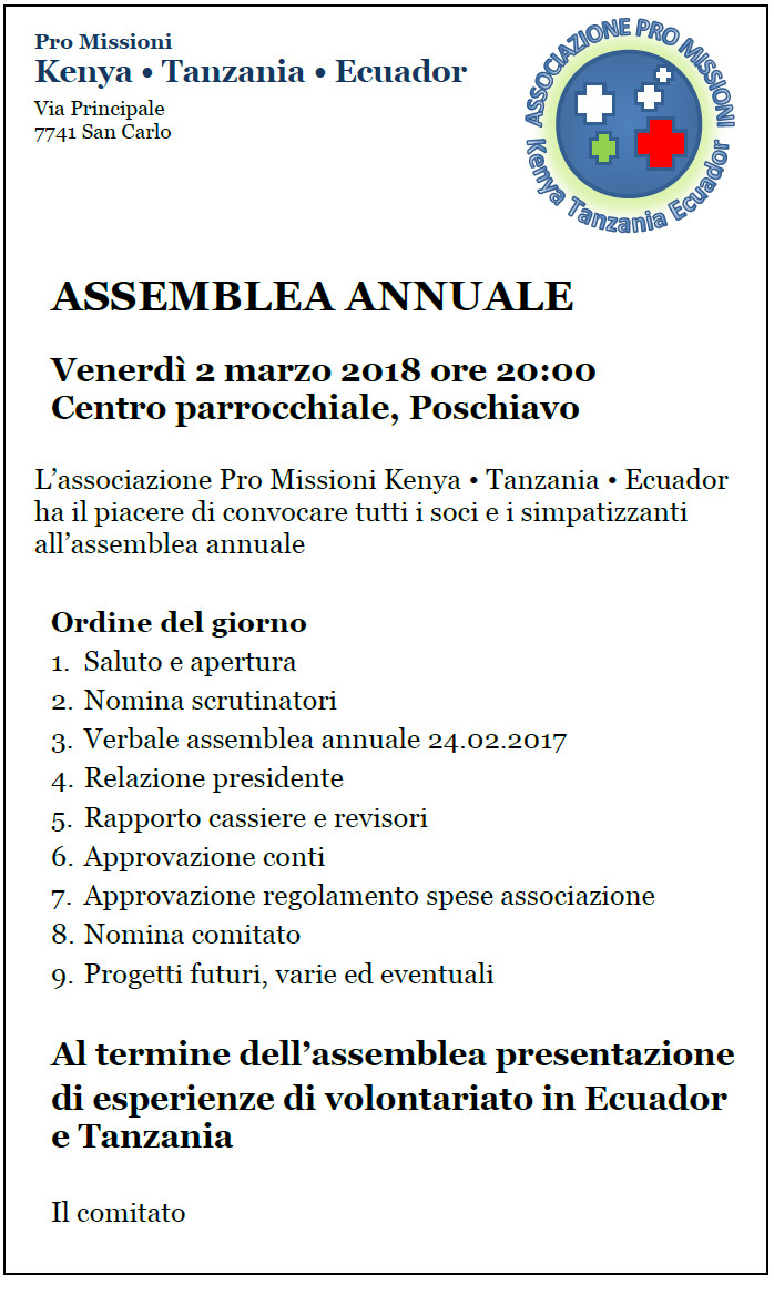 Per scoprire di più e vedere qualche immagine vi attendiamo all’assemblea annuale venerdì 2 marzo 2018 alle 20.00 presso il centro parrocchiale a Poschiavo.