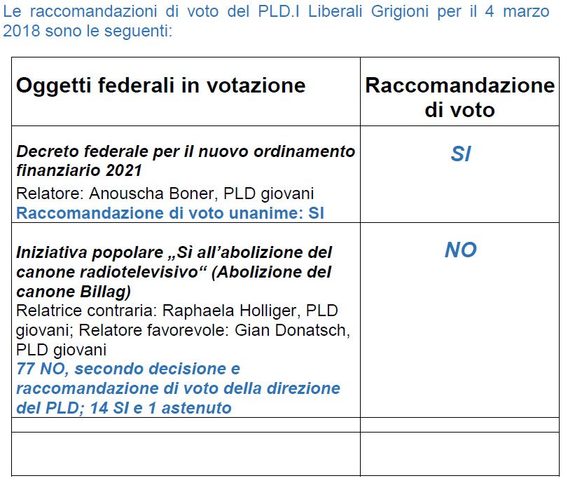Lunedì 12 febbraio 2018 si è tenuta l’assemblea dei delegati del PLD.I Liberali Grigioni. All’ordine del giorno figuravano le raccomandazioni di voto per i due oggetti in votazione il prossimo 4 marzo 2018.