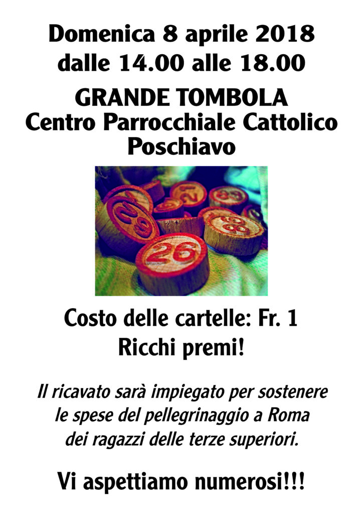 Parrocchia Cattolica San Vittore MauroCalendario Grande tombola in centro parrocchiale Domenica 8 aprile Di Parrocchia Cattolica San Vittore Mauro - 5 Aprile 2018 0 153 Domenica 8 aprile Organizzata dalle terze secondarie per finanziare il loro pellegrinaggio giubilare a Roma dal 24 al 28 aprile prossimi.
