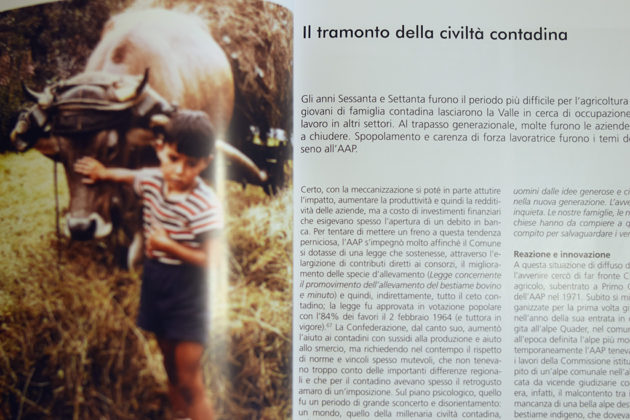 A circa metà del libro troviamo il terzo capitolo, intitolato “La svolta”. Qui, l’agronomo Daniele Raselli racconta il cambio epocale a cui abbiamo assistito negli ultimi 30 anni: “[…] il consumatore è diventato parte in causa, determinando il passaggio dall’autoapprovigionamento della famiglia contadina e dalla vendita dei prodotti alla cura mirata dell’ambiente della montagna e a una vasta offerta di servizi multifunzionali da parte delle aziende agricole in favore del ben comune di tutta la società postmoderna”.