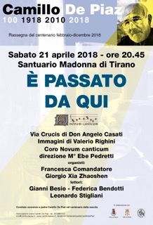 Sabato prossimo 21 aprile 2018 alle ore 20.45 si terrà nella basilica della Madonna di Tirano una manifestazione particolarmente significativa fra quelle in programma a cura del Comitato onoranze a padre Camillo De Piaz nel centenario della nascita, che si susseguiranno fino alla fine dell’anno.