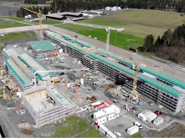 Per la realizzazione della costruzione grezza sono stati impiegati 14 000 metri cubi di calcestruzzo per costruzioni e 1300 tonnellate di acciaio di armatura. I molti impianti da integrare nella costruzione grezza per i numerosi e variegati impianti tecnici e di sicurezza che hanno dovuto essere montati nei termini previsti nonostante gli elevati ritmi di lavoro, hanno reso più complicato il lavoro degli installatori. I tetti a falda sono costituiti da elementi prefabbricati in legno per un volume di 580 metri cubi di legno per costruzioni. Il volume del tetto viene sfruttato come spazio per gli impianti tecnici dato che per via dell’elevato livello delle acque sotterranee si è in ampia parte rinunciato a procedere alla realizzazione di costosi piani interrati. Con il montaggio degli ultimi elementi del tetto della sala multiuso si sono conclusi i lavori da carpentiere e la festa di copertura dell’edificio può essere celebrata oggi con soddisfazione per il lavoro svolto.