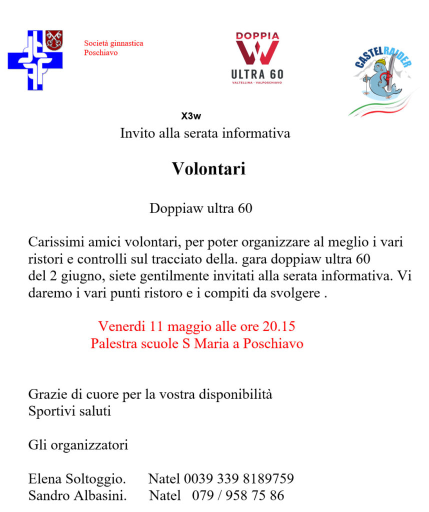 Alle 20.15 presso le palestre delle scuole di S.Maria in Poschiavo: Serata volontari Doppiaw Ultra 60.