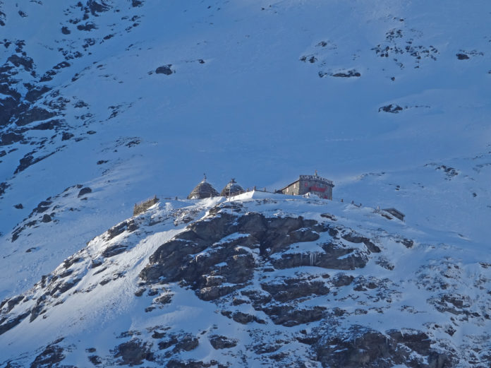 È sempre una meraviglia poter osservare dal treno della Ferrovia del Bernina il punto panoramico di Sassal Mason, con le sue note costruzioni in sasso, i cròt, illuminate dagli ultimi raggi di sole.
