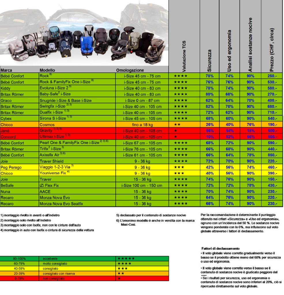 Il test annovera due prime: il Bébé Confort Axissfix Air, il primo seggiolino dotato di airbag integrato, e il Besafe iZi Flex Fix, il primo rialzo che risponde alla norma UN ECE reg. 129 (“i-Size”). Tutti i seggiolini sono stati esaminati e valutati sulla base dei seguenti criteri: sicurezza, maneggevolezza, ergonomia, presenza di sostanze nocive, facilità di pulizia e lavorazione. I 19 modelli “consigliati” o meglio ancora vanno al di là delle prescrizioni legali. Nella loro realizzazione sono state prese in considerazione le specifiche esigenze sulla tutela dei consumatori. Il Jané Gravity è stato qualificato “insufficiente” a causa del suo elevato tenore di sostanze nocive, mentre il Concord Ultimax i-Size non ha superato il test di collisione.