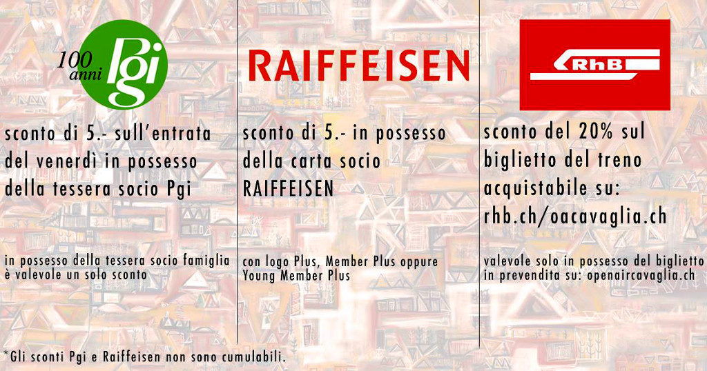 “Il prezzo del biglietto intero è di 25 CHF fino al 7 giugno, – spiega l’organizzatore Danilo Menghini – a partire da quella data in poi il prezzo salirà a 35 CHF, che è poi il costo per chi acquista il biglietto per l’intero weekend direttamente all’entrata dell’Openair. Il prezzo per la partecipazione ad una singola serata è di 20 CHF, mentre sconti speciali sono riservati ai soci della Banca Raiffeisen, ai possessori della tessera socio Pgi e a chi utilizza la Ferrovia Retica per raggiungerci”.
