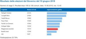 Pubblichiamo qui sotto i dati relativi alle elezioni del governo, che tuttavia potrebbero essere oggetto di una riconta (stato 10 giugno, ore 20.00), visto l’esiguo scarto tra il PBD Jon Domenic Parolini e Walter Schlegel di 68 voti.