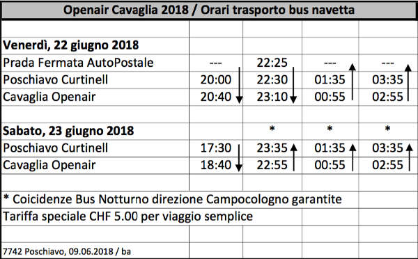 Siamo felici di annunciare che sull’arco del fine settimana del 22-24 giugno 2018, avrà luogo la seconda edizione dell’Openair Cavaglia. Appagati dal successo dell’edizione precedente, abbiamo deciso di mantenere gli stessi obiettivi e di basarci sugli stessi principi. Si tratta di un evento che offre musica dal vivo composta e interpretata da gruppi locali e provenienti da regioni limitrofe e svizzere. Ci siamo dati da fare per migliorare l’evento, per quanto riguarda l’organizzazione che lo precede, le attività ricreative e i servizi di base offerti ai partecipanti. Con il seguente annuncio, vi invitiamo a scoprire le novità che danno un nuovo colore all’evento di quest’anno.