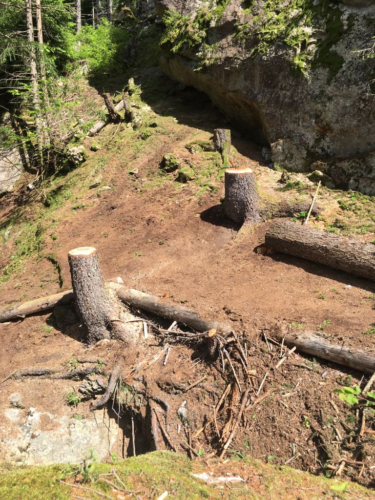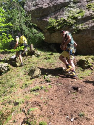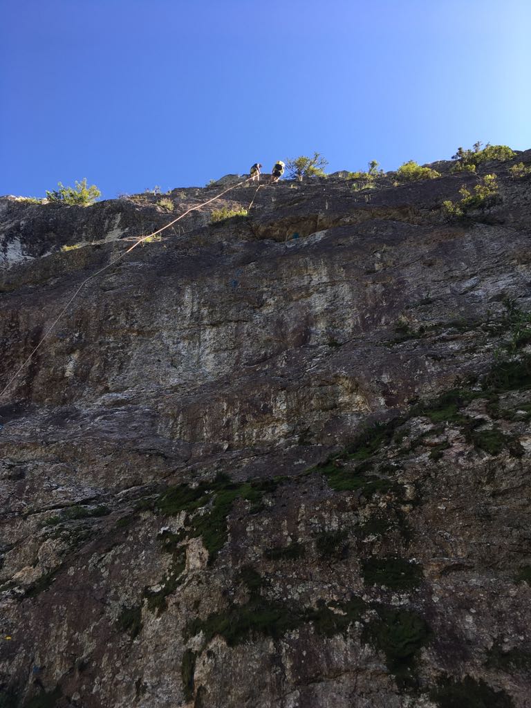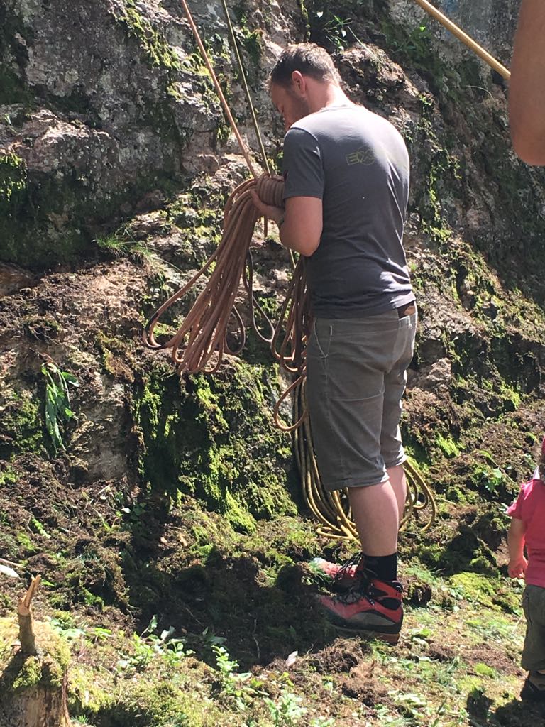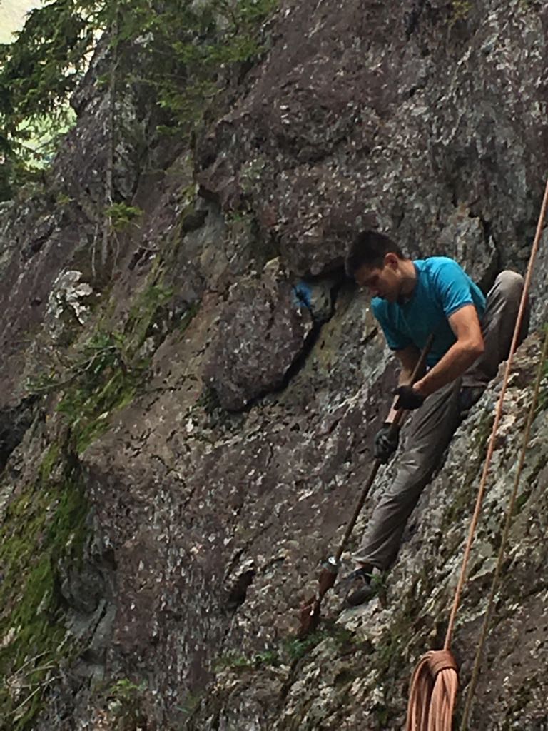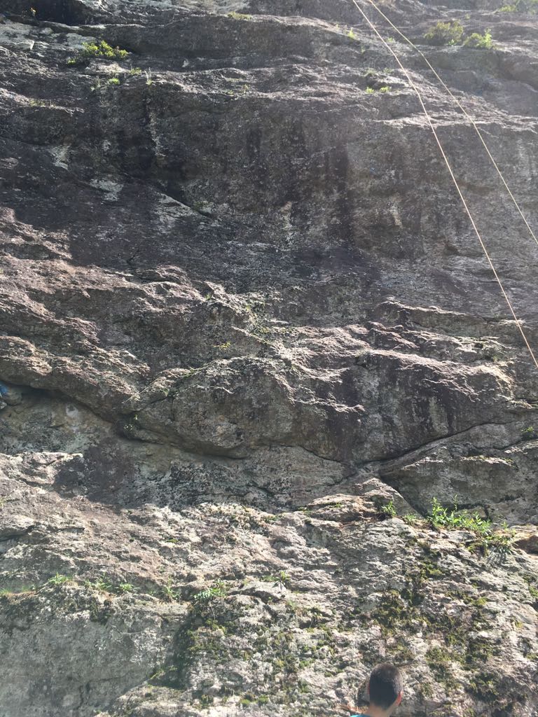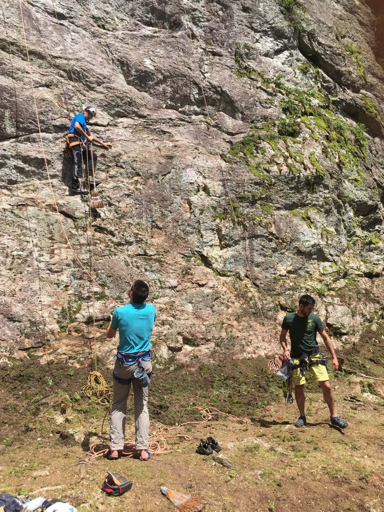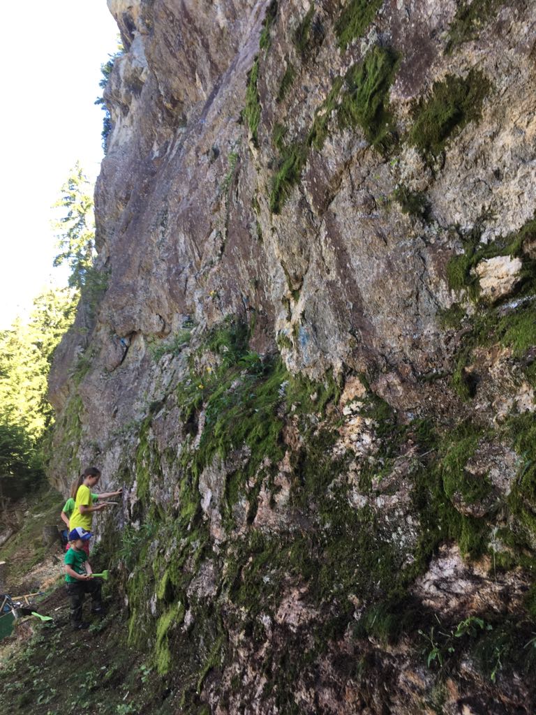 Alle 9:00 ci siamo dunque incontrati al parcheggio dell’autobus e da li siamo saliti fino alla falesia, dove gli organizzatori avevano già provveduto al taglio di alcuni grandi alberi che lasciavano poco spazio di manovra e facevano sempre ombra alla falesia. Abbiamo dunque iniziato ad ammucchiare rami e ha pulire lo spazio al di sotto della parete. Dopodiché abbiamo cominciato la pulizia della parete, la quale era ricoperta da molto muschio e altro sporco.