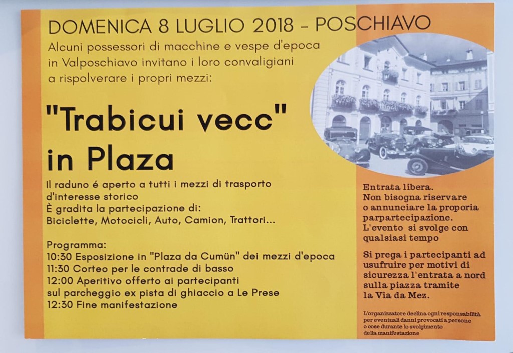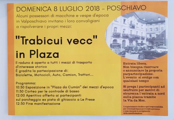 Flavio Lardi e un gruppo di amici sono riusciti nel loro intento, ovvero quello di poter offrire ai valposchiavini la possibilità di mostrare i loro veicoli d’epoca nell’accogliente piazza di Poschiavo. Oggi, domenica 8 luglio, è andata in scena la prima edizione di “Trabicui vecc” in Plaza.