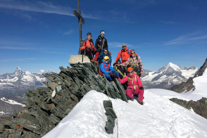 Il gruppo, condotto dalla guida alpina, Moreno Demonti era composto da 8 partecipanti suddivisi in 3 cordate da tre membri ciascuna. La gita partita dalla capanna Britannia situata a 3027m, dove abbiamo trascorso la notte, è durata complessivamente 9 ore, ma ne è valsa comunque la pena. Dalla vetta dell’Alphubel, vista la limpida giornata, abbiamo potuto scorgere il massiccio del Bernina a est e l’imponente Cervino a ovest.