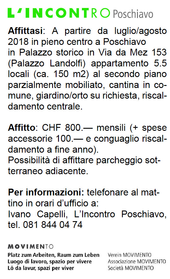 Per informazioni: telefonare al mattino in orari d’ufficio a:  Ivano Capelli, L’Incontro Poschiavo, tel. 081 844 04 74