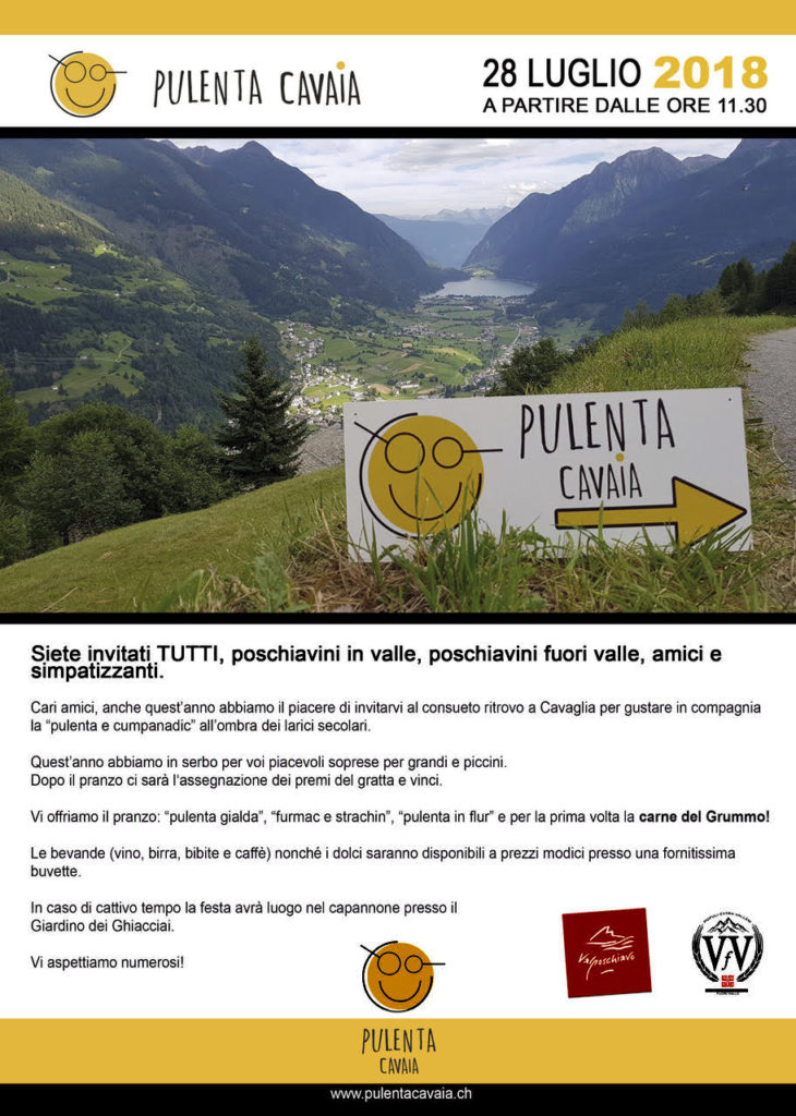 A partire dalle 11.30, in quel di Cavaglia, la tradizionale Pulenta Cavaia dell’associazione Valposchiavini fuori Valle (ex Pib).