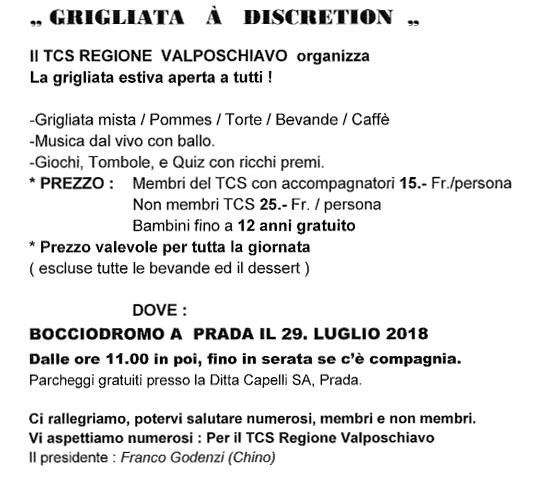 Dalle 11.00, al Bocciodromo di Prada, il TCS Valposchiavo organizza la Grigliata à discretion.