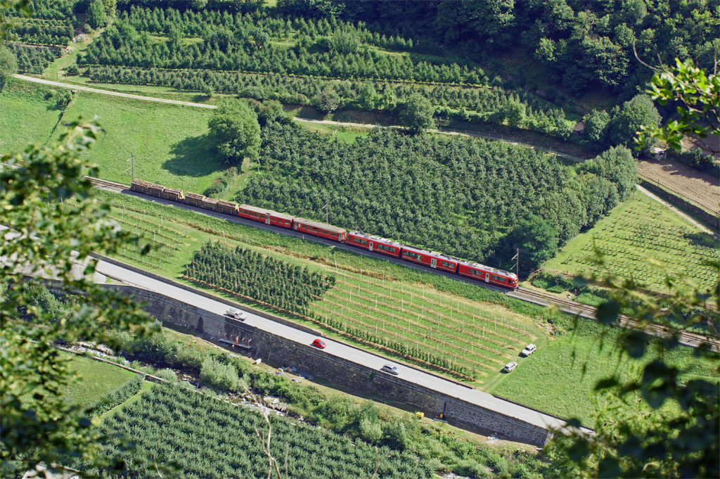 Chi transita con il treno della ferrovia del Bernina nel fondovalle può osservare svariati terrazzamenti con coltivazioni di piccoli e grandi frutti. Un paesaggio particolare.