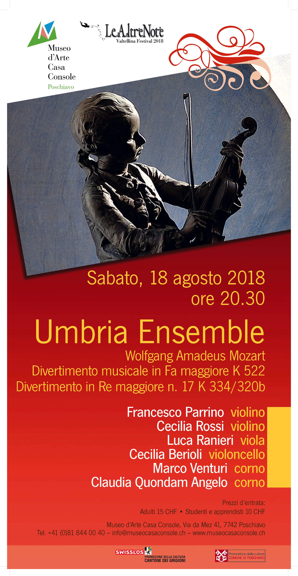 Casa Console invita cordialmente al concerto con l’Umbria Ensemble, che propone una scaletta interamente dedicata a celebri capolavori mozartiani, lo Scherzo Musicale KV 522 e il Divertimento KV 334, per restituirne le sottili allusioni beffarde e le ironiche smorfie musicali.