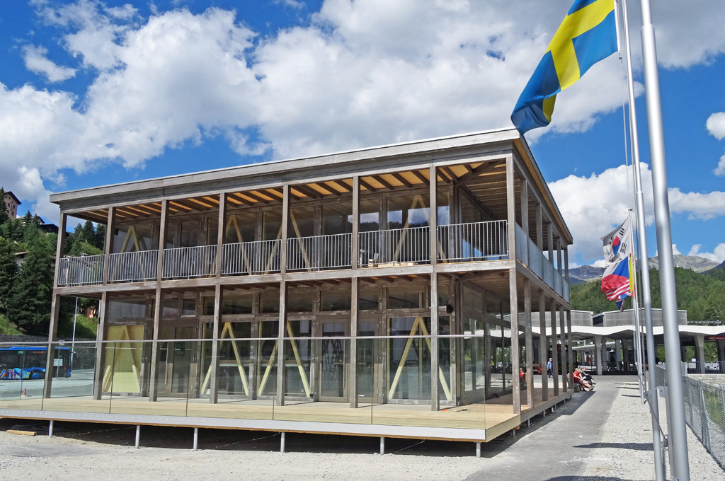 Sul piazzale della stazione di St. Moritz è stato recentemente installato, in meno di tre settimane, un edificio prefabbricato di legno con una vista sul lago particolare. È un punto di ristoro che fa parte della catena “Caffè Spettacolo”. La struttura è provvisoria, pensata per la durata di ca. 5 anni. Nel frattempo la Ferrovia Retica ed il Comune di St. Moritz stanno progettando l’ulteriore sviluppo dell’area a sud della stazione di arrivo delle linee del Bernina e dell’Albula. Entrambe festeggiano quest’anno i 10 anni di appartenenza al Patrimonio Mondiale dell’Unesco.