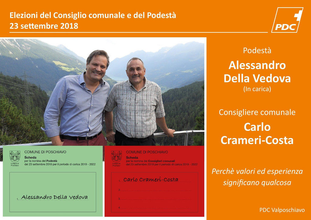 Proponendo Alessandro Della Vedova quale Podestà e Carlo Crameri-Costa in Consiglio comunale il PDC dà un contributo fondamentale all’ulteriore sviluppo del Comune nei prossimi anni, dimostrando di preferire una gestione pragmatica e lungimirante a politiche populiste e inconcludenti, senza esperienza e improvvisate.