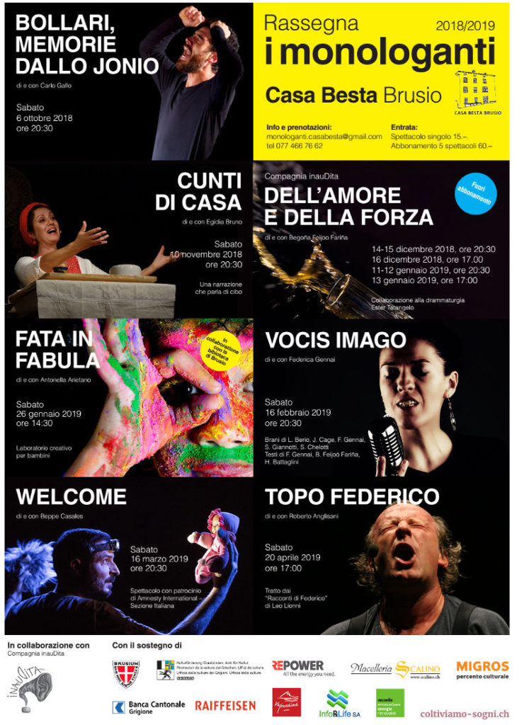 La rassegna propone, tra ottobre 2018 e aprile 2019, cinque spettacoli teatrali, una performance musicale e un laboratorio interattivo per bambini. Una novità nelle offerte di Casa Besta, che invita il pubblico a una ricca panoramica di spettacoli della scena teatrale italiana contemporanea.