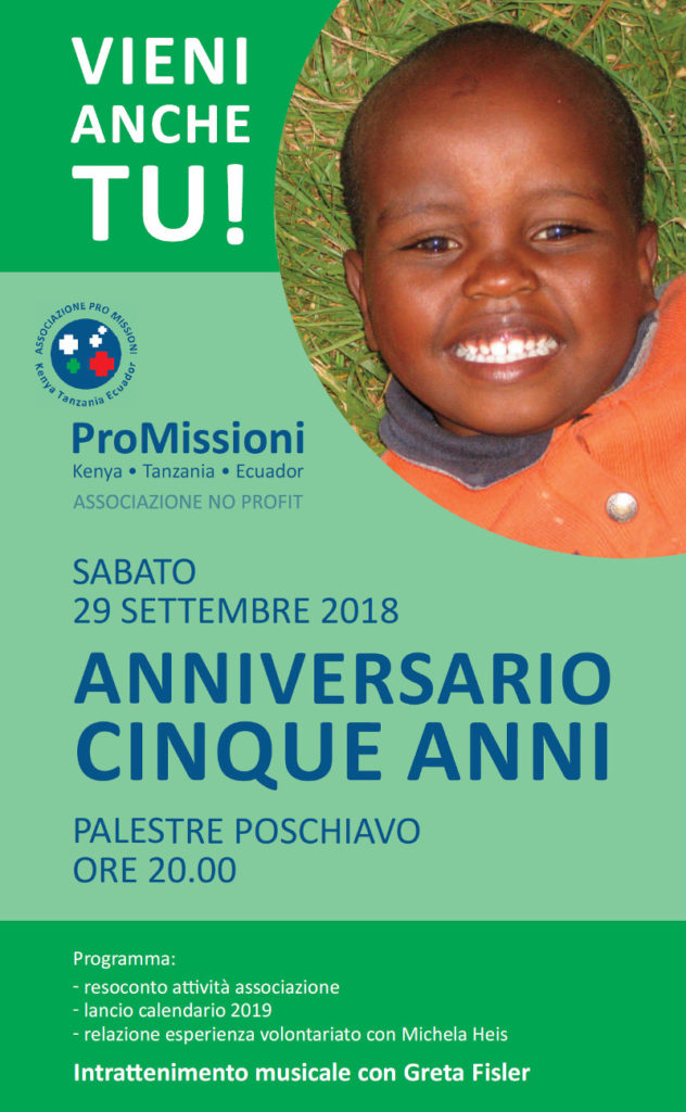 Alle ore 20.00, presso le palestre di Poschiavo, serata Pro Missioni, anniversario 5 anni.