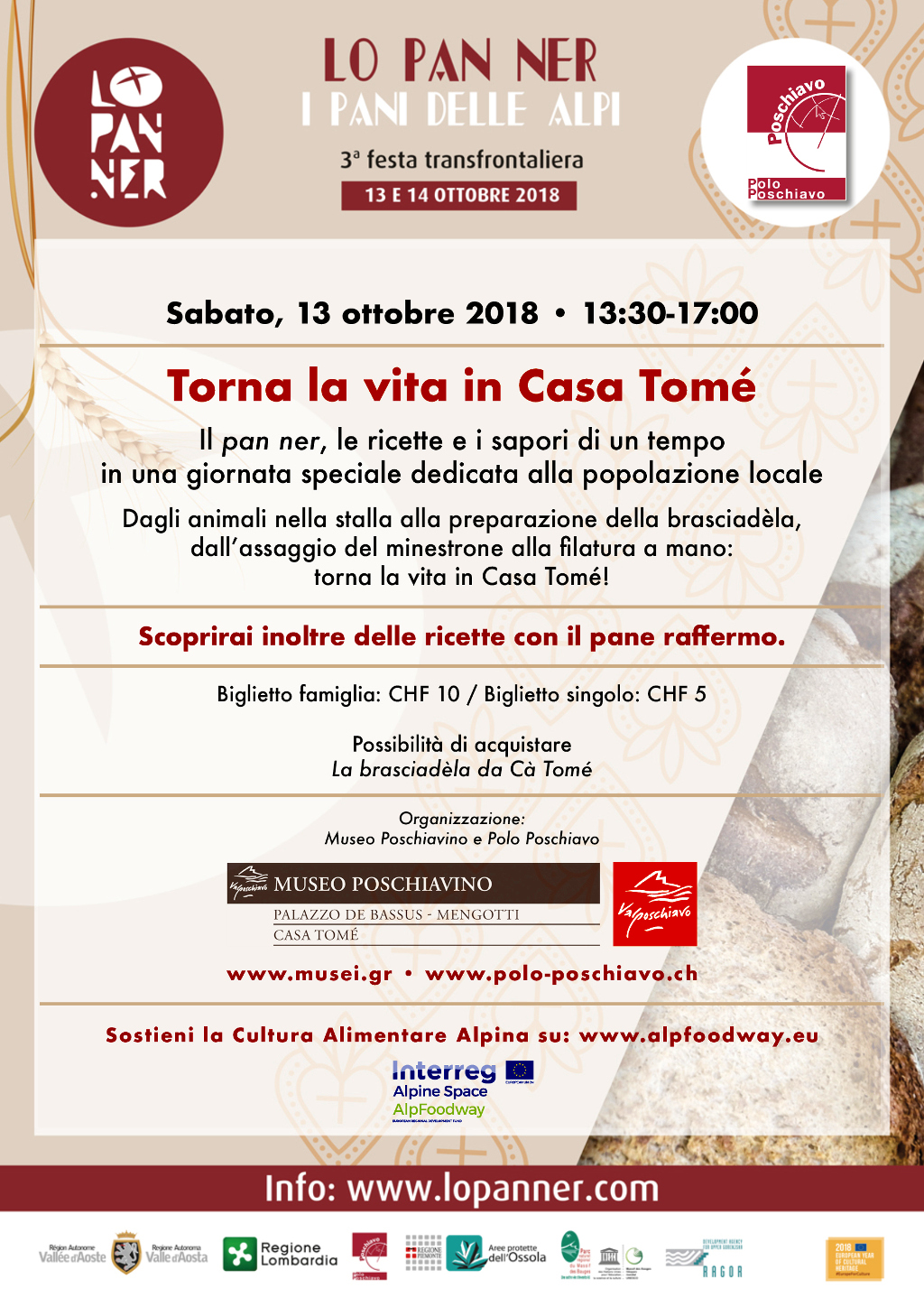 Torna anche quest’anno la Festa del Pan Ner in Casa Tomé: i gesti, i saperi e i sapori di un tempo in un pomeriggio dedicato alla civiltà agricola arrivato alla sua quarta edizione. Per l’occasione il Museo poschiavino, in collaborazione con il Polo Poschiavo, offre un programma speciale dedicato alla popolazione locale.