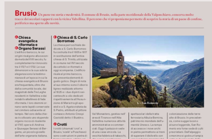 La cartina vera e propria è rappresentata sul lato anteriore. In particolare sono evidenziate cinque attrazioni principali quali il viadotto, i crotti, Casa Besta, la chiesa evangelica riformata e naturalmente non può mancare San Romerio. Come già per quella di Poschiavo, la piantina propone un percorso che accompagna lungo una visita ideale della località partendo dalla stazione. Nel caso di Brusio dapprima si percorre il nuovo sentiero fino al viadotto per poi ritornare alla partenza passando accanto a Casa Besta e attraverso il nucleo storico. Sul retro il visitatore si può informare leggendo le brevi e interessanti descrizioni dei vari punti d’interesse. Questi testi sono stati redatti da Andrea Tognina per la Società Storica Valposchiavo. Attualmente la piantina di Brusio è disponibile in italiano e tedesco. A breve seguiranno le versioni inglese e francese, e prima assoluta per gli stampati di Valposchiavo Turismo la versione giapponese! Infatti a chi non è già capitato di vedere turisti giapponesi in zona viadotto ad aspettare impazienti il trenino?