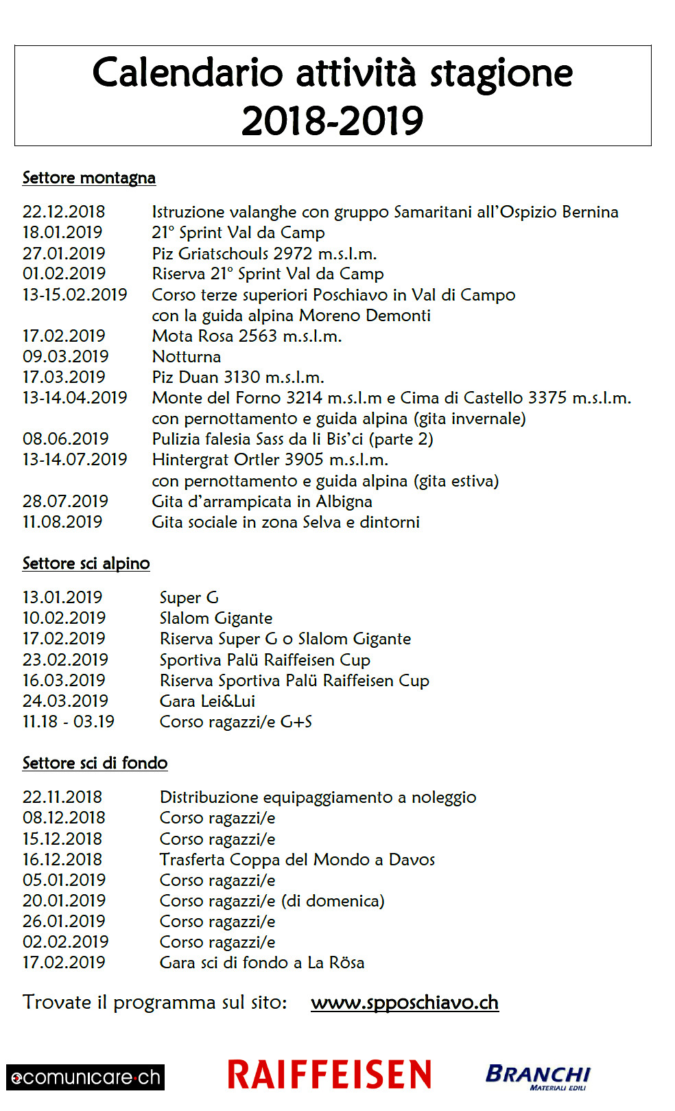 Senza categoria Calendario attività e ringraziamenti Di Sportiva Palü Poschiavo - 1 Novembre 2018 0 138 Per scaricare il calendario clicca qui. La SPP desidera inoltre ringraziare tutti i suoi sponsor.