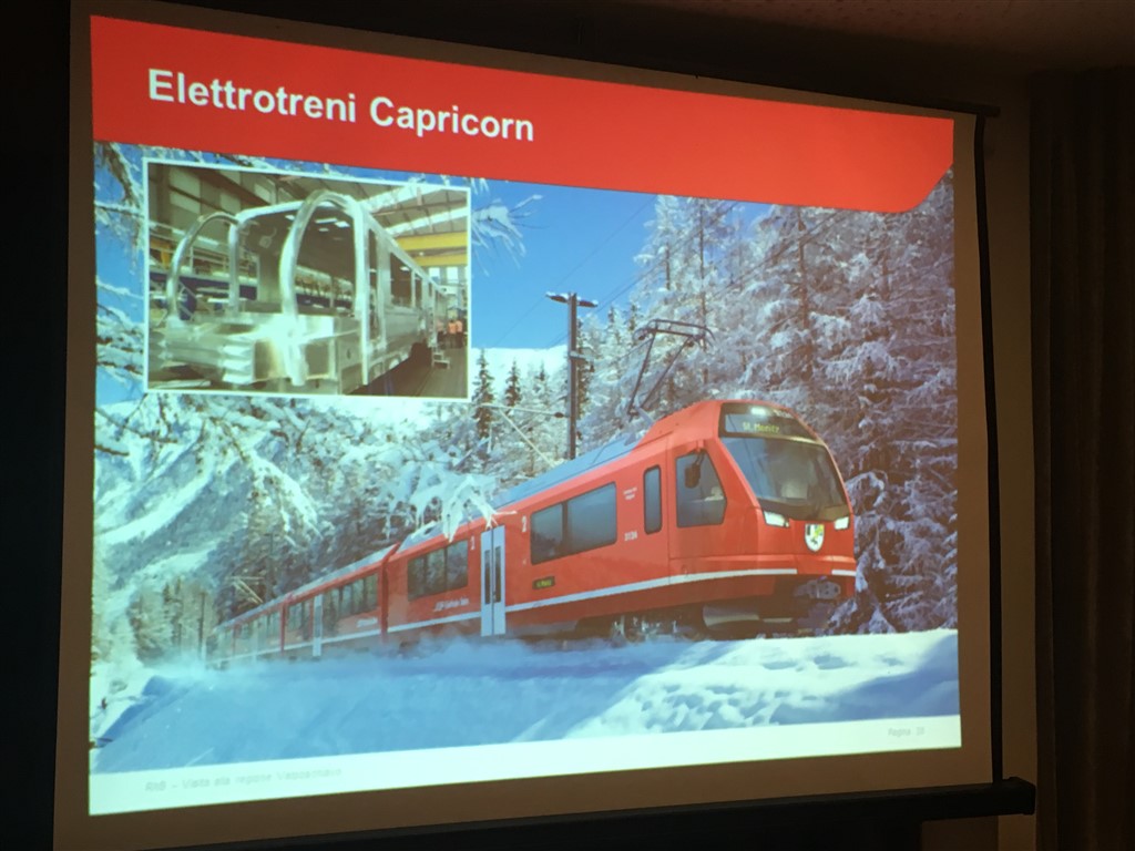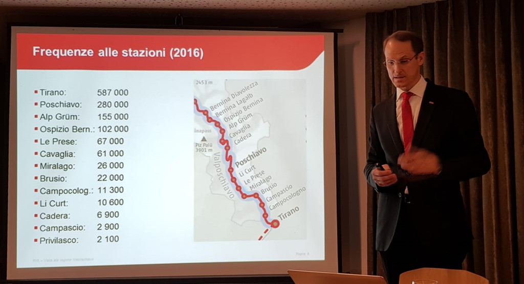 Silvio Briccola, responsabile finanze FR, ha illustrato una panoramica di quelli che sono i progetti infrastrutturali in corso di attuazione e di pianificazione su tutta la rete e nella nostra regione. Per il risanamento della stazione di Poschiavo ha dichiarato che i lavori stanno rispettando la tempistica e termineranno nel corso del 2019. Questo importante risanamento (con stazione d’incrocio Pradei e doppio binario) ha come finalità il perfezionamento dell’orario cadenzato e una percorrenza ridotta, ma per un ulteriore sviluppo in tal senso si sta già progettando un doppio binario anche in zona Li Foppi, presso Cadera.