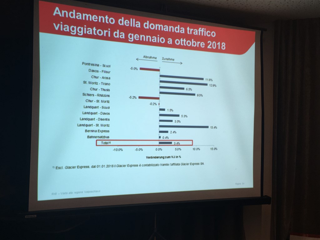 Complessivamente nel 2017 vi è stato un aumento di circa il 10% delle frequenze rispetto al 2016 e le previsioni per l’anno in corso sono buone e segnalano i maggiori incrementi nelle tratte con nuove attrazioni turistiche, come ad esempio la Coira-Arosa (offerta sciistica e orso Napa), oppure la Filisur-Davos (treni d’epoca). La tratta del Bernina rimane comunque un piatto forte dell’intera rete ferroviaria retica e i dati del 2018 confermano anche qui un ulteriore incremento. Un aumento – sembrerebbe – dovuto anche alla grande notorietà raggiunta a livello svizzero del tracciato per biker Ospizio Bernina-Poschiavo.