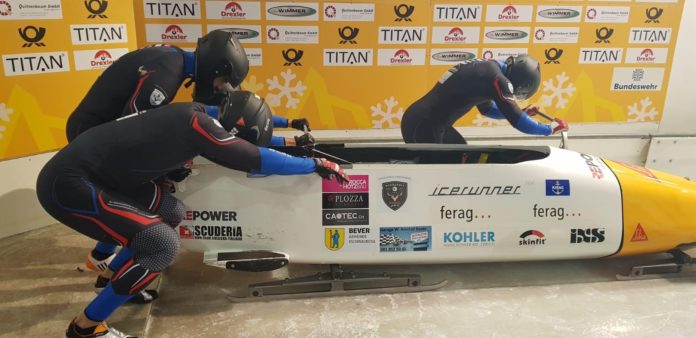 Foto di Königsee del 16.12.2018: il pilota engadinese Cédric Follador con i frenatori Jones Gregory e i ticinesi Farut Dominguez e Alexander Crotta.