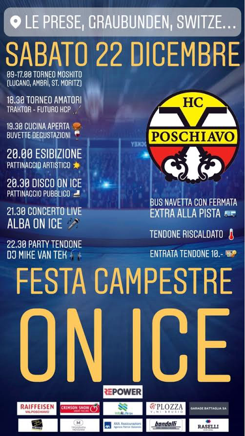 Dalle 9 in avanti i Moskito, categoria U12, sfideranno i coetanei di Lugano, Ambrì e St. Moritz. Il torneo si prolungherà su tutto l’arco della giornata. Alle 18:30 spazio al torneo amatori, con Traktor e Futuro HCP a sfidarsi. Dalle 19:30 la cucina e la buvette con degustazioni sarà aperta. Seguiranno un’esibizione del pattinaggio artistico, il pattinaggio pubblico con la disco on ice, un concerto live con la band valligiana “Alba” e poi tutti a festeggiare nel tendone riscaldato con alla console DJ Mike Van Tek. Vi aspettiamo…