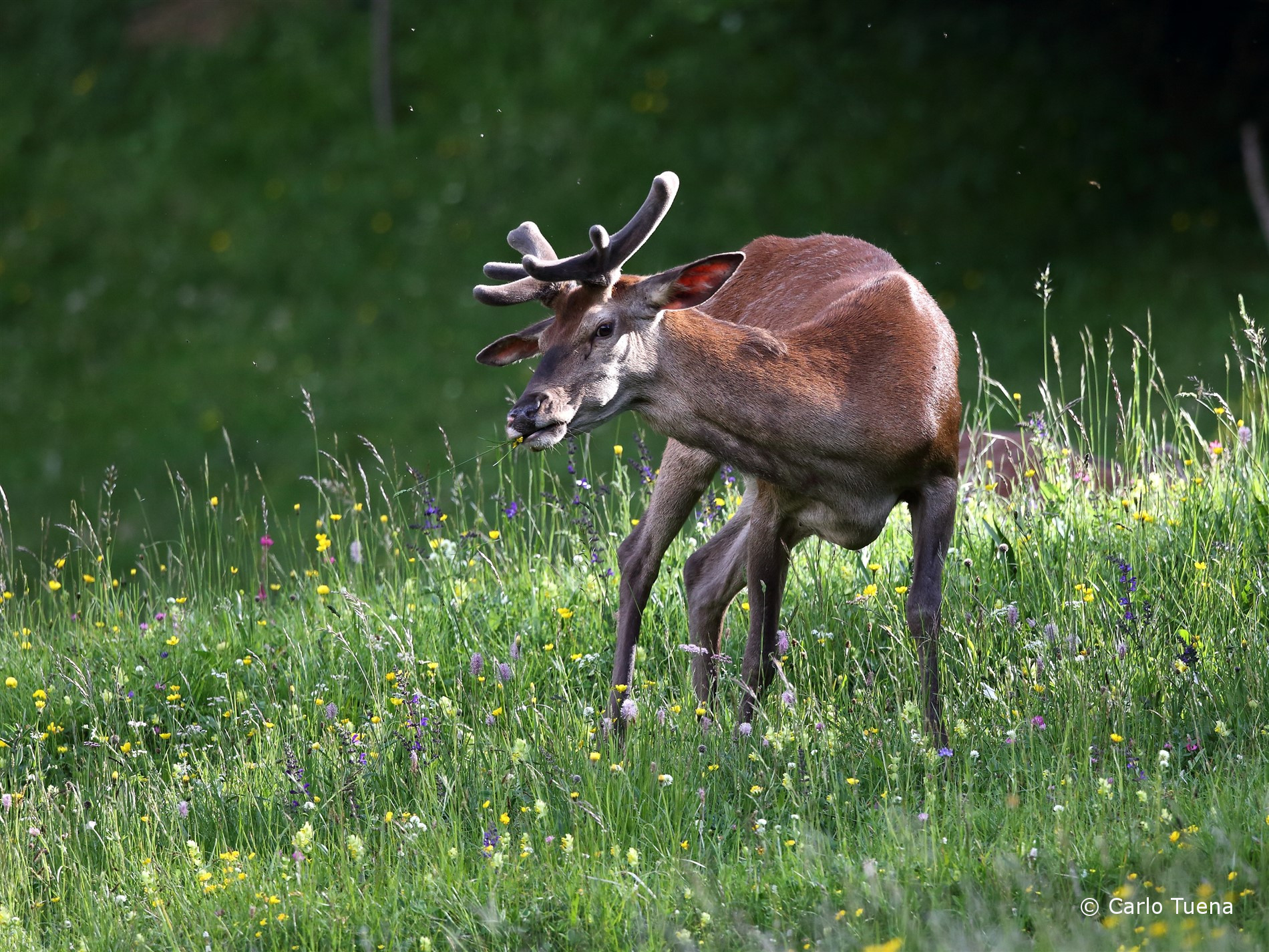 Giovane cervo con le corna di velluto e i fiorellini in bocca!