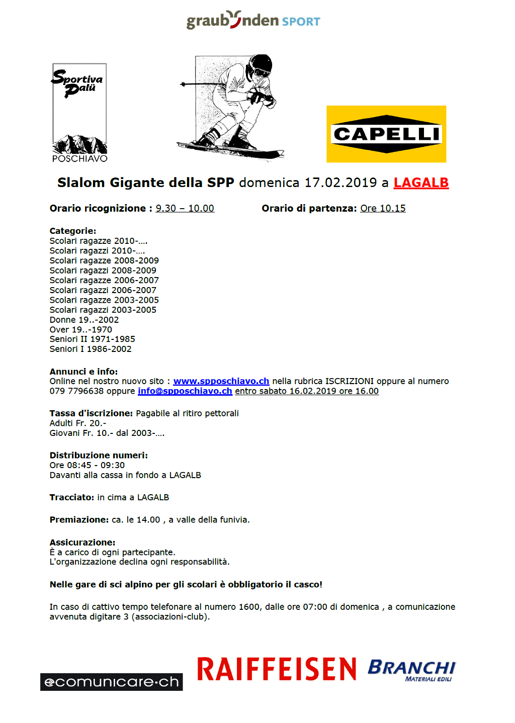Top Slalom gigante della SPP Domenica 17 febbraio Di Sportiva Palü Poschiavo - 10 Febbraio 2019 0 362