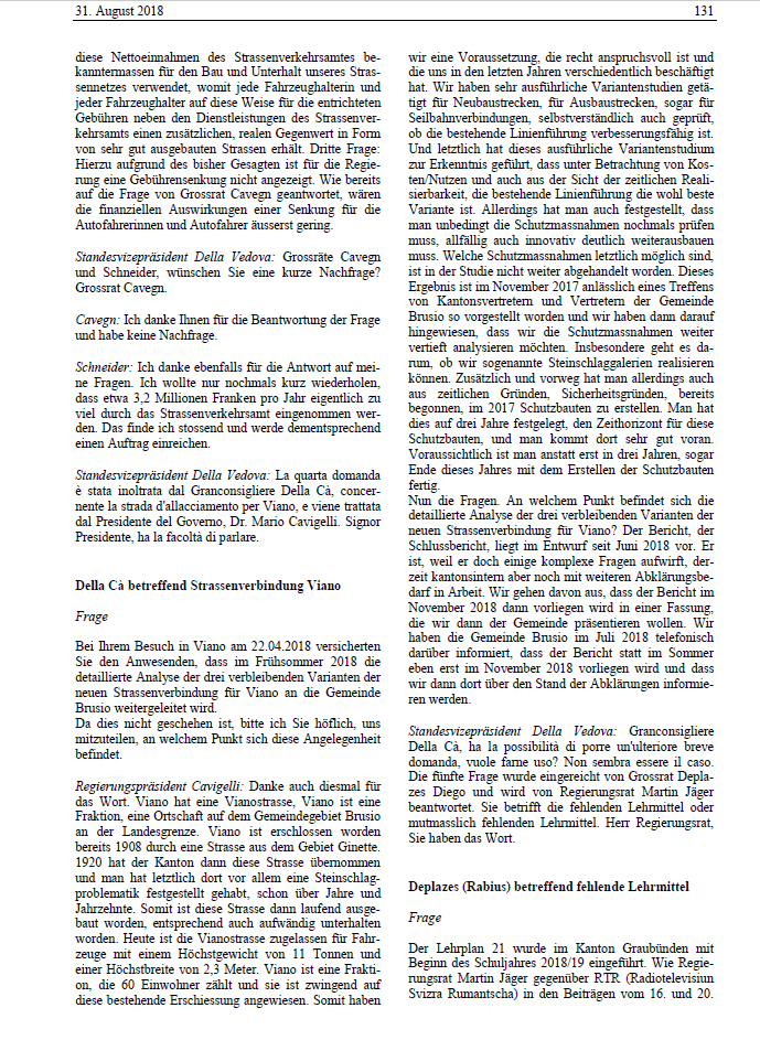 - Le risposte date dall’ingegnere cantonale Reto Knuchel nella vostra intervista non possono essere considerate come una presa di posizione ufficiale del Governo. Una prima risposta ufficiale del capo del Dipartimento costruzioni, trasporti e foreste, Mario Cavigelli, si può già apprendere dal verbale della sessione di Gran Consiglio del 31 agosto 2018 (allegato 1 e allegato 2), in cui durante l’ora delle domande il sottoscritto gli aveva rivolto una prima domanda relativa all’analisi sulle tre varianti stradali praticabili per migliorare il collegamento verso Viano che il Cantone intendeva proporre al Comune di Brusio.