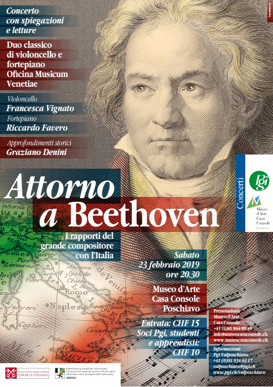 Nella sala concertistica di Casa Console a Poschiavo si terrà sabato 23 febbraio 2019, alle ore 20.30, l’esibizione del duo violoncello e fortepiano dell’ensemble Oficina Musicum Venetiae con brani musicali di Beethoven e dei suoi amici/rivali, abbinati ad approfondimenti storici riguardanti i rapporti del grande compositore con il mondo musicale italiano e gli influssi sulla cultura del Belpaese. L’evento nasce da una proposta della Scuola Musicale di Poschiavo ed è frutto della collaborazione fra Museo d’Arte Casa Console e Pgi Valposchiavo.