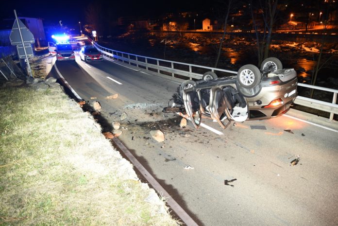 Sabato mattina, un automobilista 27 enne, accompagnato da 4 passeggeri, stava viaggiando lungo la starda cantonale H13 da Roveredo in direzione di San Vittore. Verso le ore 05:20, il conducente ha perso la padronanza del veicolo andando a urtare frontalmente contro un muretto in sasso ubicato a lato della carreggiata. In seguito si è capovolto sul tetto ostruendo la strada.